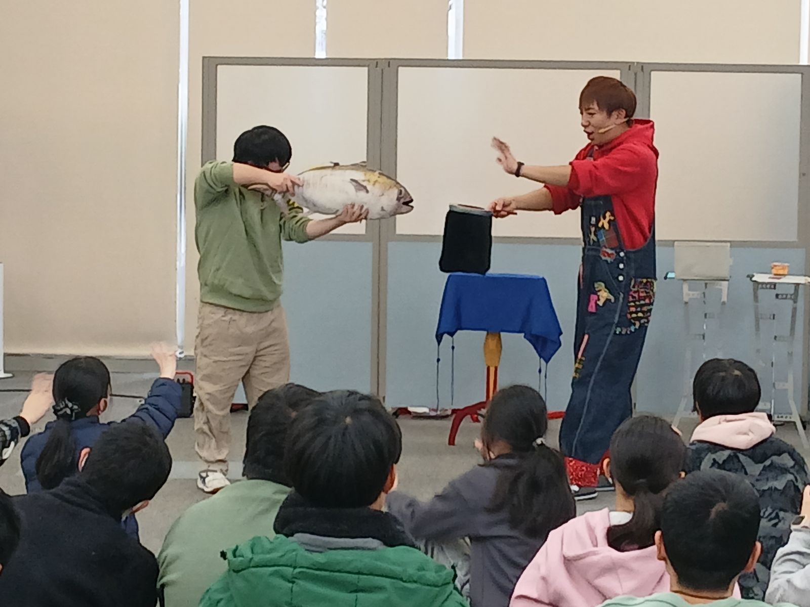 魔法の杖(なぜか魚)とみんなで「おまじないー!」と唱えると‥袋からたくさんのハンカチが出てきましたー!?