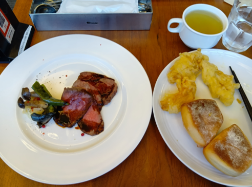 お昼ご飯はビッフェとローストビーフとパンケーキを食べました。