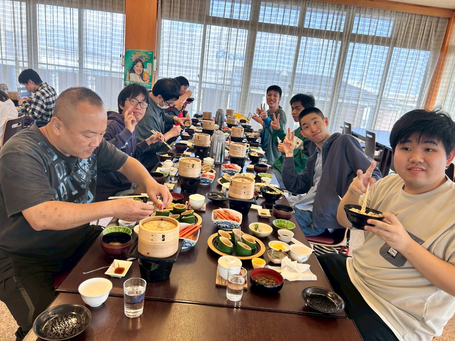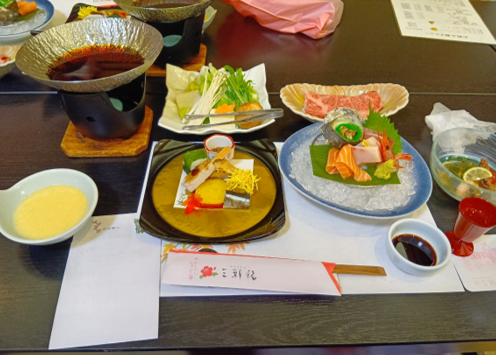 旅館ではみんなで夕食を食べました美味しかったです。